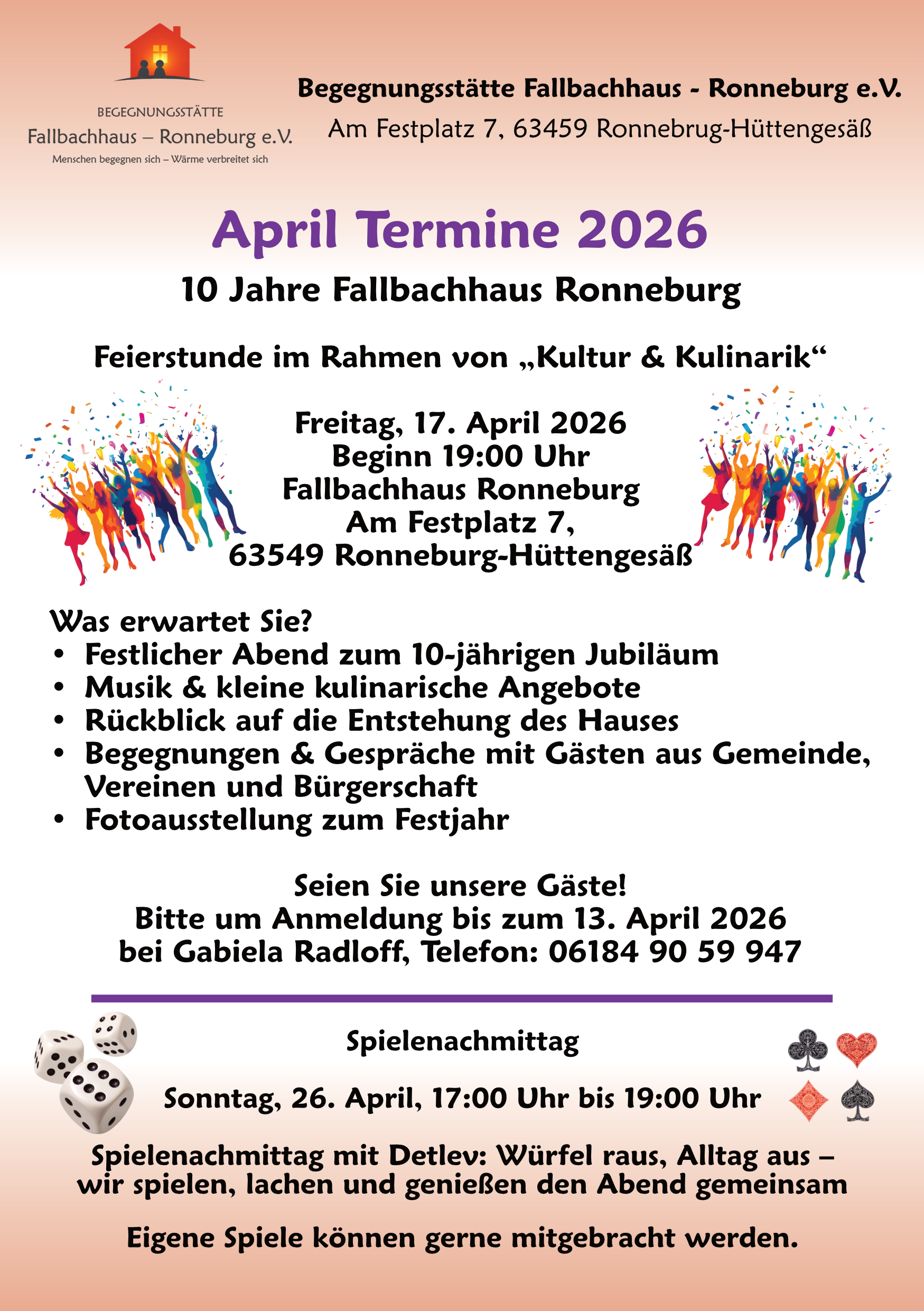 Der Begegnungsstätte Fallbachhaus – Ronneburg e.V. wurde gegründet, um die Begegnung der und Treffpunkte für Menschen jeden Alters – getragen von Ehrenamt und Engagement.